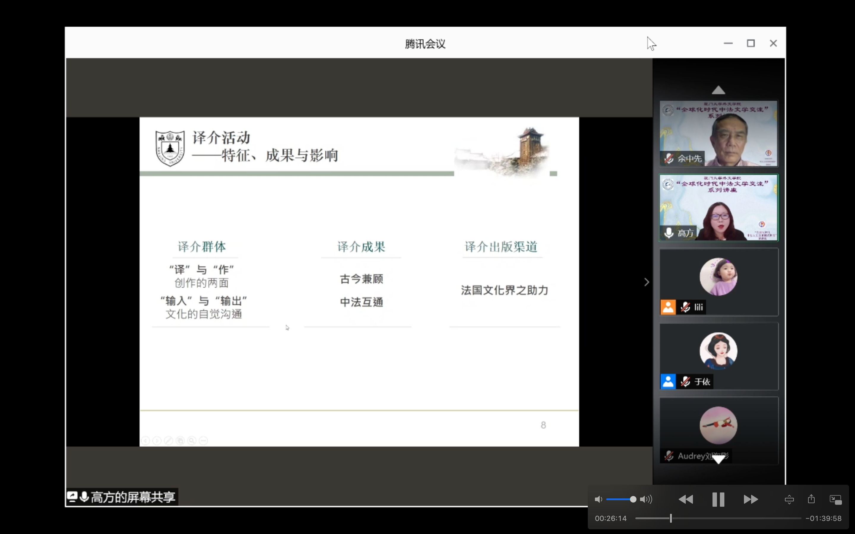 最后,高教授总结到,在20世纪20、30乃至40年代,里昂中法大学译者群体在中法、中西文学交流、思想互鉴方面的贡献和影响是相当大的,他们的译介实践丰富了中外文学交流史和翻译史。